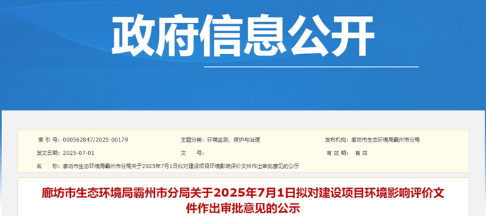 廊坊市生态环境局霸州市分局发布关于2025年7月1日拟对建设项目环境影响评价文件作出审批意见的公示。