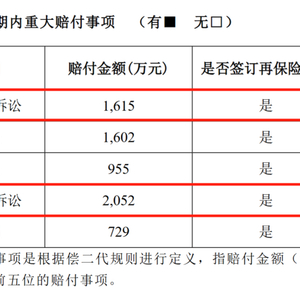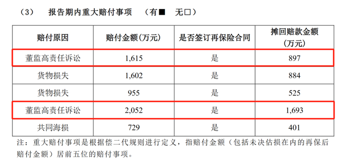 以美亚财险为例,今年一季度,该公司在偿付能力报告中披露了2笔原因为“董监高责任诉讼”的重大赔付事项,赔付金额分别为1615万元、2052万元,摊回赔款金额分别为897万元、1693万元。