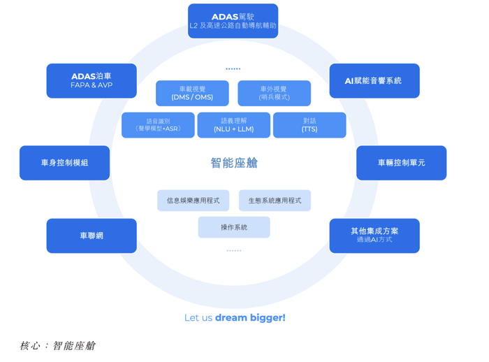除此之外,产品整合多项AI驱动功能,包括车内视觉功能(如DMS/OMS)、车外视觉功能(例如哨兵模式)、声学自动语音识别(ASR),以及基于自然语言理解(NLU)与大型语言模型(LLM)的先进语义理解能力。