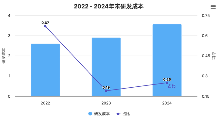 从研发成本看,2022-2024年研发成本分别为2.61亿元、2.9亿元、3.57亿元,分别占营收比例为67.3%、19.2%、25.1%。2023年占比明显下降是因其营收增长强劲。