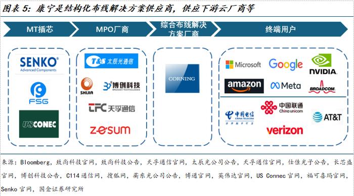 MPO产业链上游原材料主要为MT插芯等,供应商包括US Conec、福可喜玛、扇港等。太辰光是MPO连接器供应商,通过康宁间接供应终端客户,康宁的下游客户包括英伟达、Lumen、博通、微软等。