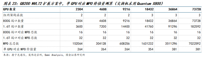 我们测算得到在GB200 NVL72扩展方案中,两层网络单GPU对应MPO价值量约为$264,三层网络架构下由于光器件用量的提升,单GPU对应MPO价值量提升至$354-381。