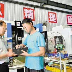 6月25日,霸州市信安镇仁义街党支部书记刘树马(左)在宏伟机械有限公司检查机械部件产品质量。 本报记者 王 伟摄