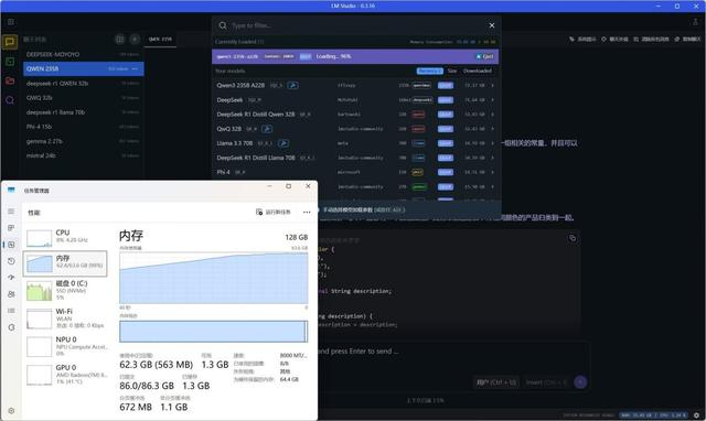 其次则是内存。AI应用想要顺利运行的前提是成功加载大模型,而参数量越大的模型,加载时所需的内存容量就越大。如下图所示,加载Qwen3-235B-A22B-IQ2_S的MoE混合大模型时,内存峰值占用接近64GB,如果没有超大内存支持的话,根本就无法成功加载模型,更遑论去运行AI应用了。