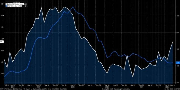 目前市场预期通胀下半年反弹,即使剔除关税以及财政支出等政策影响,下半年CPI的季调因素也会对通胀形成压力。根据目前的数据进行预测,6月CPI的整体环比和核心环比较5月可能反弹至0.3%,同比增速从2.4%反弹至2.8%左右。同时作为CPI先行指标,ISM服务业价格分项因关税影响正在快速上升。