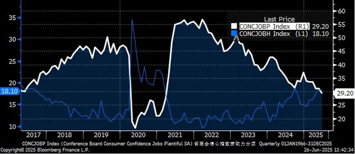 在消费者信心指数劳动力分项中,劳动机会充足指标明显下降,难以找到工作指标则明显上升。