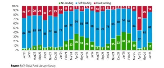 年度的时点来看,市场定价下半年4次会议降息65bp,更偏软着陆的方向。这与美国银行6月份的全球投资者调查结果一致,有66%的投资者预计经济软着陆,16%的认为经济不着陆,只有13%的人认为经济会硬着陆(4月份该值是49%)。而年初投资者对全球经济软着陆的预期概率是50%,无着陆的概率是38%(近8个月高点),硬着陆的概率为5%(近6个月的低点)。同时,美国股票配置比例也较年初的高位明显下降。