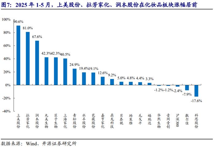 2025年1-5月,上美股份、拉芳家化、润本股份在化妆品板块中涨幅居前。2025年1-5月,化妆品板块所选公司中共15家上涨、4家下跌。其中,上美股份、拉芳家化、润本股份在化妆品板块中涨幅居前,累计涨幅分别为90.6%、81.0%、67.6%;2025年1-5月跌幅靠前的分别为敷尔佳、壹网壹创、华熙生物。