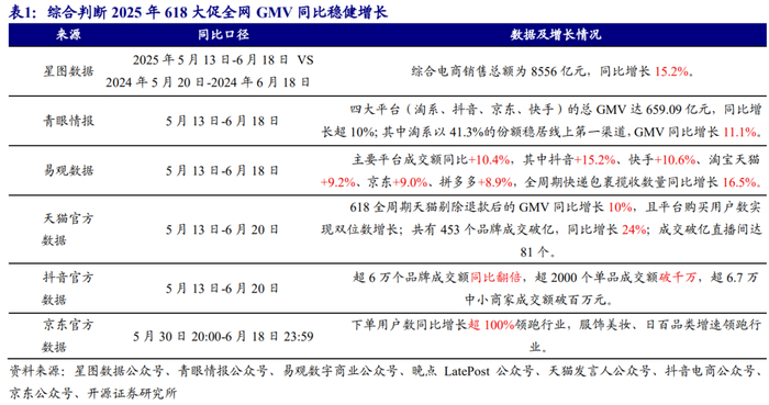 2025年618大促全网GMV实现高质量增长。618大促收官,整体周期达到历年最长,即从2024年的5月20日至6月18日延长至2025年的5月13日至6月20日(以天猫为例,各平台周期略有差异)。根据星图数据,2025年618购物节综合电商销售总额为8556亿元,同比增长15.2%。分平台看,618全周期天猫剔除退款后的GMV同比增长10%,为三年来最大幅度的增长,共有453个品牌成交破亿,同比增长24%,且平台购买用户数实现双位数增长。抖音电商超6万个品牌成交额同比翻倍,超2000个单品成交额破千万。此次618大促各电商平台以官方立减替代复杂满减,保障价格力的同时,有助于回归消费者真实需求,提高大促增长质量。