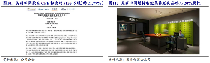 (1)2025年6月,迈诺威医药研发的去氧胆酸注射液“纤塑®”正式获国家药监局批准上市,成为国内首款合规溶脂针产品,产品适用于双下巴、腹部等顽固脂肪堆积区域。随着监管通道的打开,该赛道有望逐步释放市场潜力。(2)美丽田园医疗健康股东CPE拟减持约5133万股(约21.77%)并退出主要股东行列,长远看有助于优化公司治理结构。此外,5月公司公告增持奈瑞儿20%股权,持股比例升至90%,强化内生外延战略。公司“生美+医美+亚健康”高质量转化的优质商业模式持续验证,中长期有望同步实现市占提升与盈利改善。