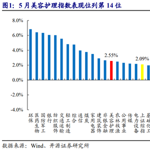 5月美容护理指数上涨2.55%,位列第14位。美容护理指数5月报收4833.94点,涨幅为2.55%,在所有一级行业中位列第14位,表现弱于大盘(5月上证综指上升2.09%)。