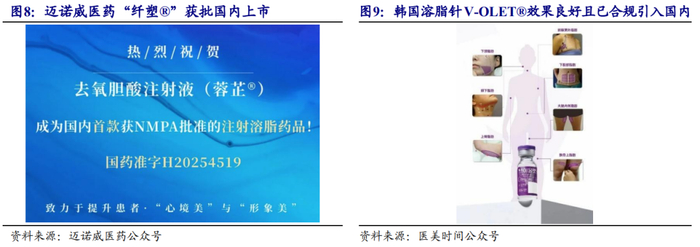 迈诺威医药研发的“纤塑®获批成为国内首款合规溶脂针产品。2025年6月10日,南京迈诺威医药旗下自主研发的首款注射溶脂药品—去氧胆酸注射液正式获得国家药监局批准上市(国药准字H20254519),用于改善成人因颏下脂肪堆积导致的中至重度轮廓凸出或过度丰满(俗称“双下巴”)。此次获批标志着迈诺威打破合规壁垒,实现国产溶脂针实现从0到1的突破。在此之前,全球注射溶脂市场主要由两款产品主导——艾尔建旗下的Kybella(ATX-101)和大熊制药V-OLET®,后者于2025年4月通过海南博鳌乐城“特许药械”政策进入中国市场。迈诺威医溶脂针的正式获批为消费者提供了新的选择,据众智研究院预测,2023年中国溶脂针市场规模约1.35亿元,预计2025年增至8.05亿元,2030年突破39亿元,随着监管通道的打开,该赛道有望逐步释放市场潜力。
