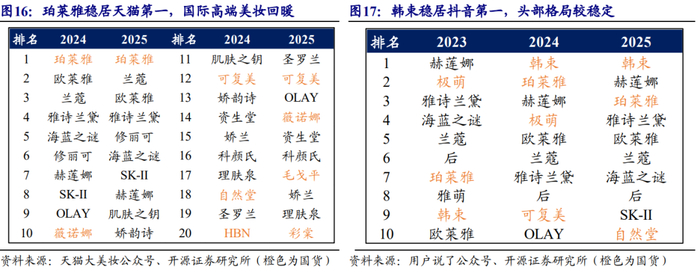 本月618大促收官,根据星图数据,此次618购物节综合电商销售总额为8556亿元(同比+15.2%)。各电商平台以“官方立减”替代“复杂满减”,保障价格力的同时回归消费者真实需求,提高大促增长质量。美妆大盘方面,根据青眼情报数据,618全周期四大平台美妆类目总GMV达659.09亿元(同比增长超10%)。具体品牌而言,国际高端大牌有所回暖,兰蔻、欧莱雅、雅诗兰黛、赫莲娜等均在天猫、抖音平台稳居前列,TOP10榜单国际品牌份额提升,国际大牌的增长得益于强大的品牌效应和对达播的加大投入,在平台以质量考核为核心下,国际高端美妆展现较强增长韧性。国货品牌方面,珀莱雅和韩束分别稳居天猫及抖音美妆第一,天猫平台毛戈平增长超70%,双妹增长超300%,功效护肤新锐绽媄娅同比增长超900%;抖音平台毛戈平彩妆、彩棠排名大幅提升。整体而言,强品牌力的美妆龙头和新锐功效品牌在此次618大促中脱颖而出。