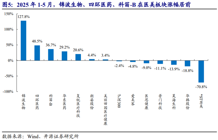 2025年1-5月,锦波生物、四环医药、科笛-B在医美板块涨幅居前。2025年1-5月,医美板块所选公司中共计7家上涨、6家下跌。其中,锦波生物、四环医药、科笛-B在医美板块中涨幅居前,累计涨幅分别为127.8%、48.5%、36.7%;2025年5月跌幅靠前的分别为华韩股份、昊海生科、普门科技。