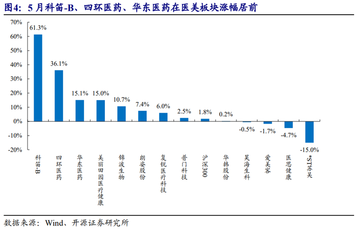 医美(选取13家上市公司):5月个股涨幅靠前为科笛-B(+61.3%)、四环医药(+36.1%)、华东医药(+15.1%);化妆品(选取19家上市公司):5月个股涨幅靠前为拉芳家化(+28.0%)、水羊股份(+24.5%)、芭薇股份(+19.1%)。