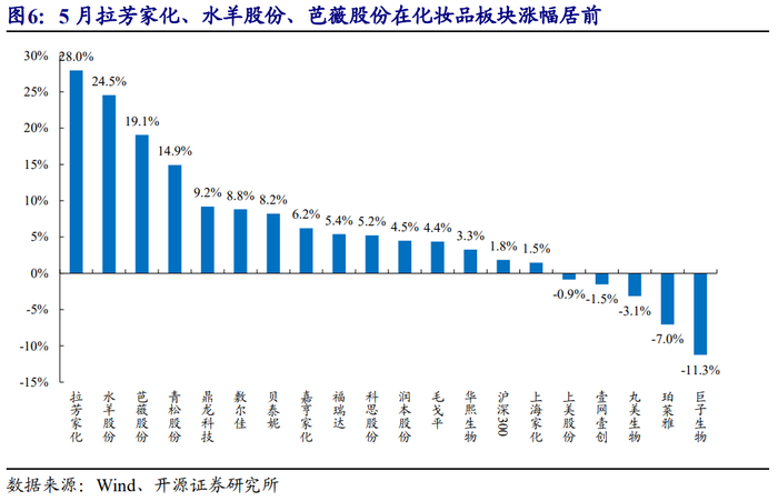 5月,拉芳家化、水羊股份、芭薇股份在化妆品板块涨幅靠前。在我们选取的19家化妆品上市公司中,5月共计14家上涨、5家下跌。其中,4月涨幅靠前的为拉芳家化、水羊股份、芭薇股份,月涨幅分别为28.0%、24.5%、19.1%;月跌幅靠前的分别为巨子生物、珀莱雅、丸美生物。