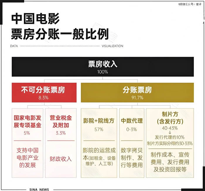 制作方拿到这笔钱之后,发行方一般又得从这 43% 里分出一部分的发行代理费。所以七七八八算下来,片方的分成就被砍得不到 40% 了。