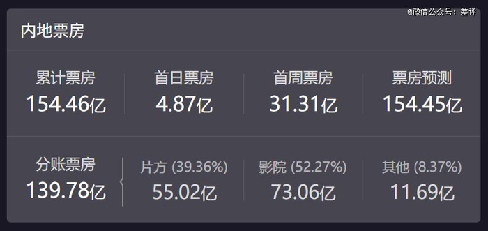 《 哪吒2之魔童降世 》的累计票房是 154.46 亿元。但实际上,到片方手上只有 55.02 亿元,换算过来只拿到了票房里的 35.6 %,三成多一点。