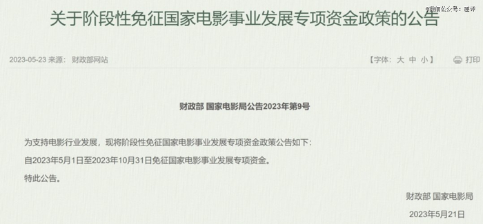 此前 2023 年 5 月到 10 月这两个暑期档和国庆档的电影,国家就减免了电影专项资金的征收。