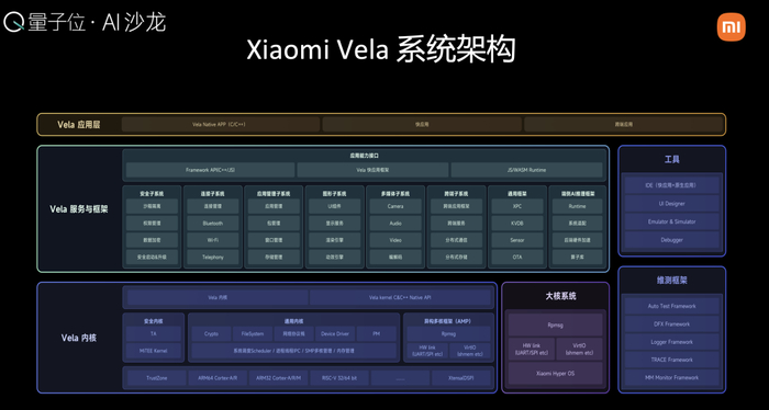 针对这一行业痛点,小米Vela设计了异构双芯融合系统。系统架构分为三层:Vela内核基于开源实时NuttX操作系统构建,增加了异构多核能力;服务与框架层封装了6个子系统,集成端侧AI推理框架;应用层支持native APP、快应用和跨端应用。