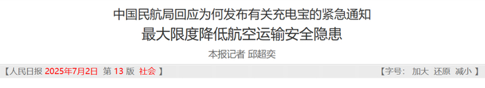 据人民日报7月2日报道,中国民航局日前发布紧急通知,自6月28日起,禁止旅客携带没有3C标识、3C标识不清晰、被召回型号或批次的充电宝乘坐境内航班。