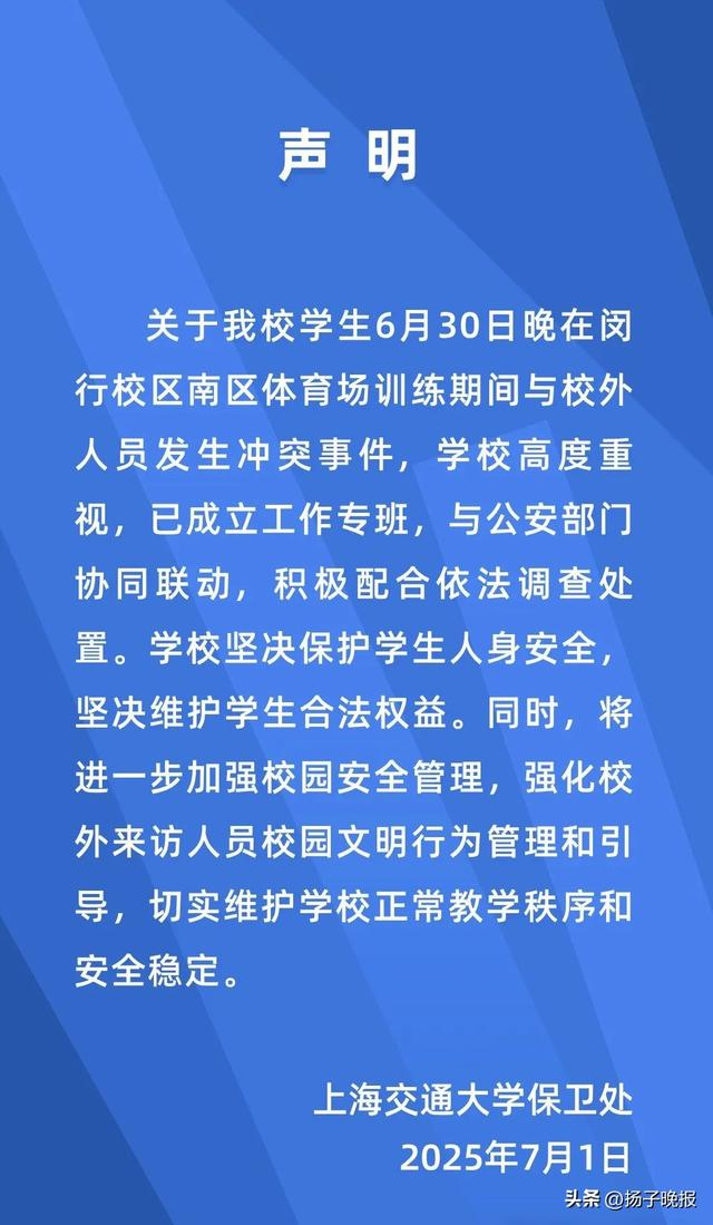 关于我校学生6月30日晚在闵行校区南区体育场训练期间与校外人员发生冲突事件,学校高度重视,已成立工作专班,与公安部门协同联动,积极配合依法调查处置。