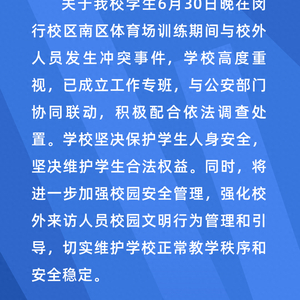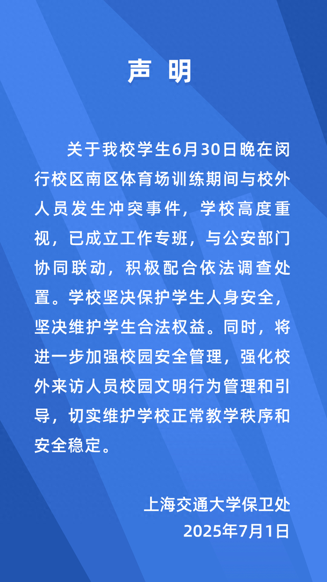 关于我校学生6月30日晚在闵行校区南区体育场训练期间与校外人员发生冲突事件,学校高度重视,已成立工作专班,与公安部门协同联动,积极配合依法调查处置。学校坚决保护学生人身安全,坚决维护学生合法权益。