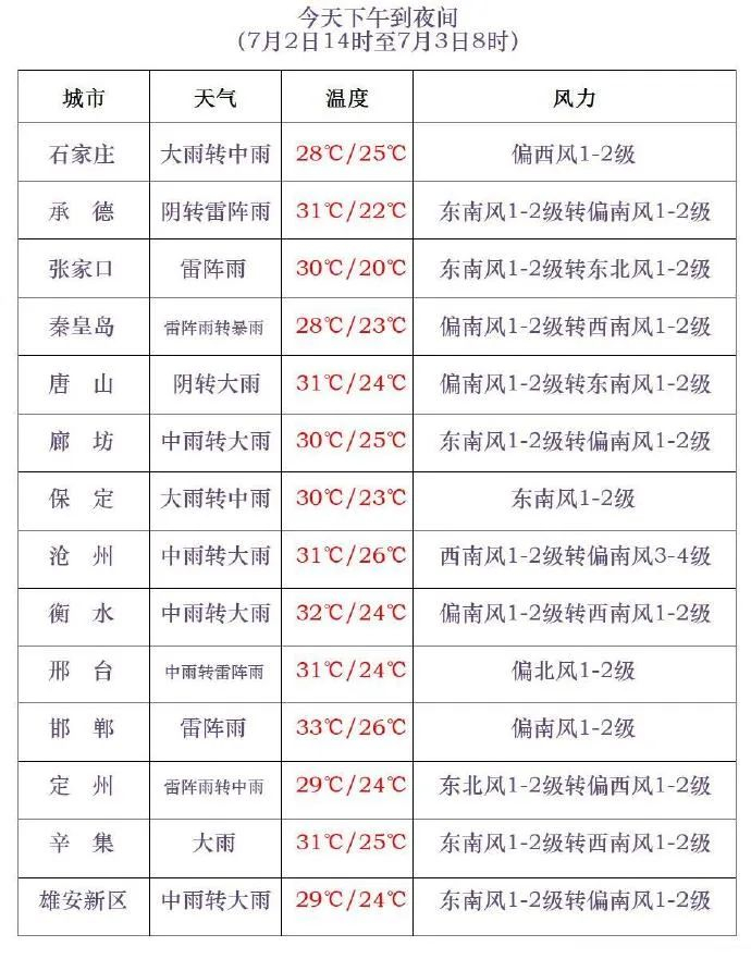 今天下午到夜间,承德南部、唐山、秦皇岛、保定东部、雄安新区、廊坊、石家庄、沧州、衡水、邢台西部和渤海海域阴有大雨到暴雨,个别地点有大暴雨,其他地区阴有雷阵雨或阵雨,雷雨时局地伴有短时强降水、短时大风等强对流天气。最高气温,张家口北部、承德北部、保定西北部26~28℃,其他地区29~33℃。最低气温,张家口、承德、保定西北部13~22℃,其他地区23~27℃。