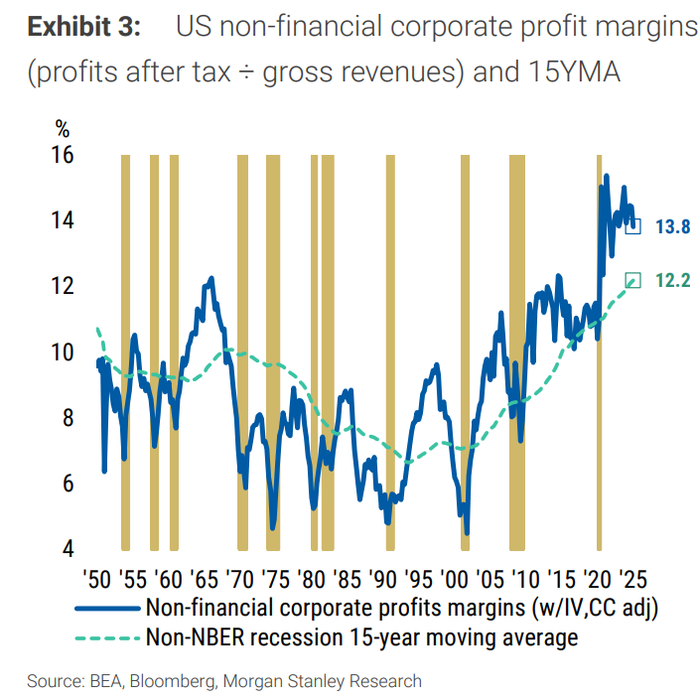 据大摩测算,2025年第一季度,美国非金融企业利润率为13.8%,但目前已在过去15年均值水平12.2%附近。