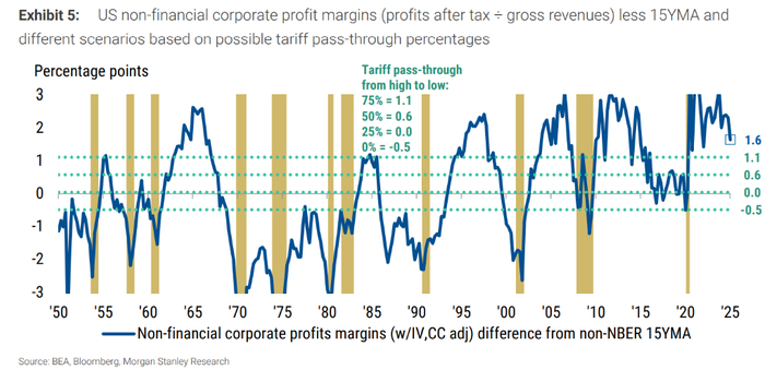 如果企业将75%的关税成本转嫁给消费者,利润率将维持在比15年均值水平高1.1个百分点;