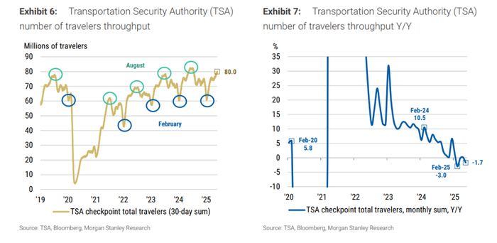 报告并指出,除了关税压力外,其他经济指标也显示出放缓迹象。美国运输安全管理局数据显示:
