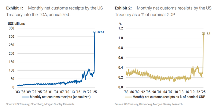 美国关税收入已经达到惊人的规模,年化达到3270亿美元,占GDP的1.1%。摩根士丹利称,无论这笔巨额税收是生产者还是消费者承担,都将对经济增长产生负面影响。