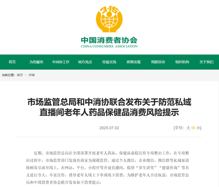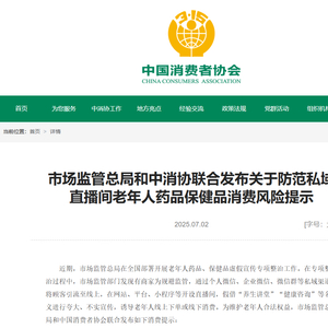 7月2日,市场监管总局和中国消费者协会联合发布消费提示,防范私域直播间老年人药品、保健品消费风险。