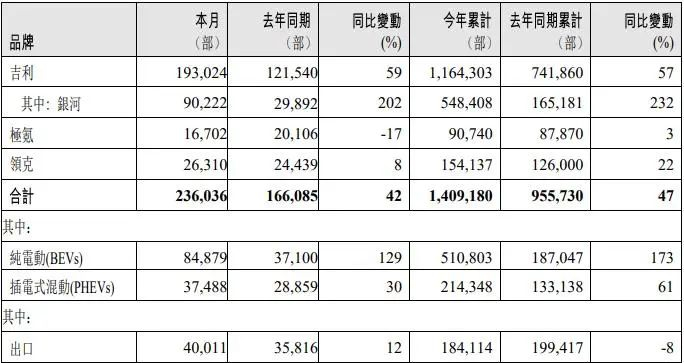 6月吉利汽车总销量约23.6万辆,同比增长约42%;其中,纯电动汽车销量为8.5万辆,插电式混动汽车销量为3.7万辆。