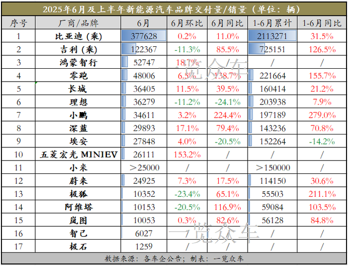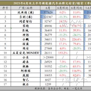 (本文仅统计截至2025年7月2日已公布交付量/销量的国内车企及品牌。合资品牌及未发布数据的品牌,我们将在后续的文章中更新,欢迎留言补充。)