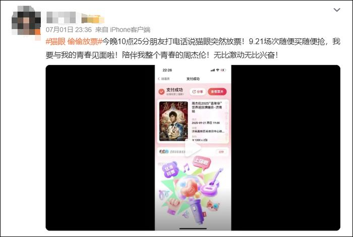 7月1日晚,有网友在社交平台反映,猫眼平台上的周杰伦济南演唱会突然偷偷放票。