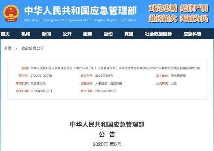 为有效履行防范化解重大安全风险、应对处置各类灾害事故的职责使命,根据《国家综合性消防救援队伍消防员招录办法》(人社部发〔2021〕58号,以下简称《招录办法》)等法规政策,现就国家综合性消防救援队伍2025年面向社会招录消防员相关事项公告如下: