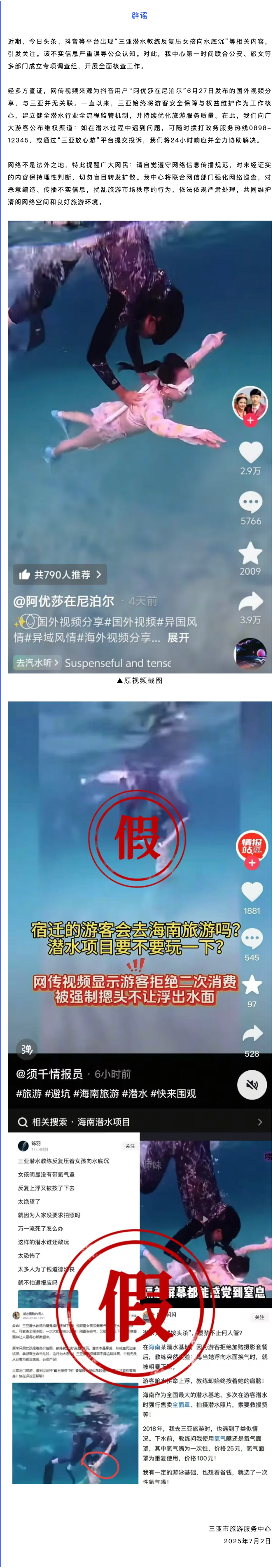 7月2日,三亚市旅游服务中心发布辟谣声明称:近期,网络平台出现“三亚潜水教练反复压女孩向水底沉”等相关内容,引发关注。该不实信息严重误导公众认知。对此,中心第一时间联合公安、旅文等多部门成立专项调查组,开展全面核查工作。经多方查证,网传视频来源为抖音用户“阿优莎在尼泊尔”6月27日发布的国外视频分享,与三亚并无关联。