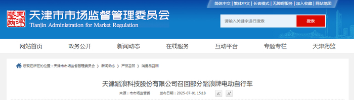 天津踏浪科技股份有限公司召回部分踏浪牌电动自行车