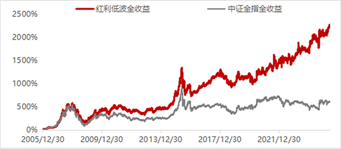 Wind数据显示,自基日以来(2005/12/30)红利低波全收益指数取得了2268.65%的涨幅,在接近20年的时间里取得了23倍(2318%)的收益,可谓是A股市场的“长红策略”之一。