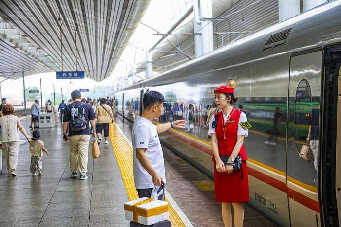 站台上,丹东站客运值班主任巴丹在引导旅客上车时告诉记者:“针对7月1日调图,丹东站提前谋划、周密部署,积极组织对涉及股道变化的21列,涉及时刻变化的47列列车逐岗位进行培训,做到掌握变点,心中有数。同时,利用官方平台及时发布列车时刻调整、车次变更等重要信息,并在扶梯、地道等重点处所增派服务引导人员,开辟了安检、检票进站、站台乘车专用绿色通道,为旅客提供更加高效、便捷的出行服务。”