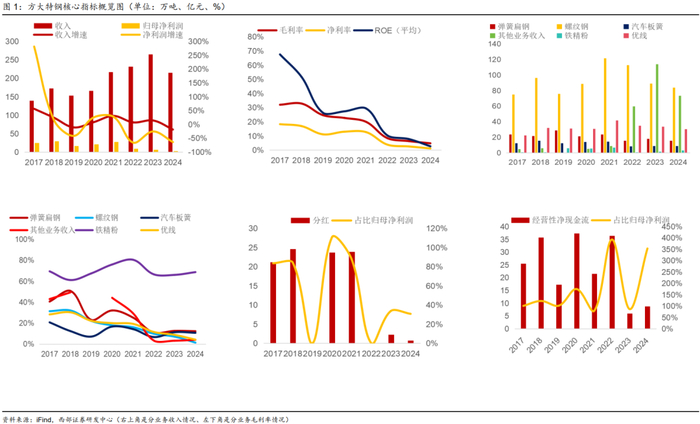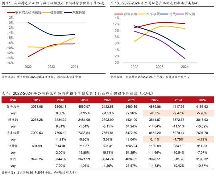 1)管理:与钢铁行业头部企业相比,公司作为民营企业,机制灵活,销售费用率低,核心管理层薪酬激励弹性大、员工薪酬和业绩直接挂钩;2)产品:从标准化走向定制化、从生产端走向客户端,差异化发展战略卓有成效,无论是价格还是盈利,弹簧扁钢和汽车板簧均显著高于行业平均水平;3)成本:公司通过从铁前工序到全流程的系统性降本和精细化的管理,使得2022-2024年原材料成本、人工成本、制造成本都出现了较为明显的下降;4)外延:集团内,达州钢铁和萍钢股份注入上市公司值得期待;集团外,通过收购兼并,整合钢铁行业资产,做强做大自身钢铁板块业务,亦值得期待。