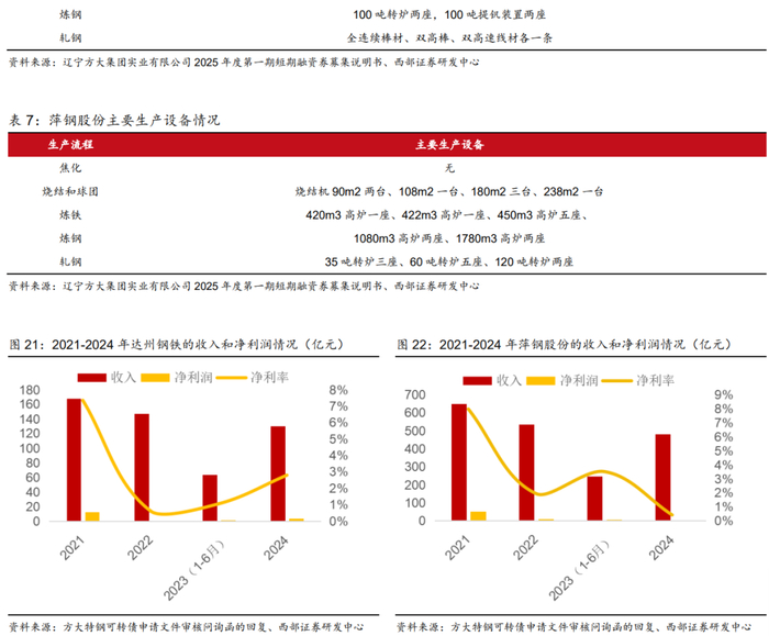 萍钢股份:前身为萍乡钢铁厂,始建于1954年,是江西省最早建成投产的钢铁企业,截至2025年3月末,已成为一家集炼焦、烧结、炼铁、炼钢、轧钢全流程生产工艺的大型钢铁联合企业,拥有萍安钢铁和九江钢铁两家全资子公司,主要产品为建筑用热轧带肋钢筋、高速线材、小型材、中厚材。2021、2022、2023(1-6月)、2024年萍钢股份收入分别为650.58、535.77、247.34、482.51亿元,净利润分别为51.84、10.35、8.68、2.02亿元。根据《关于方大特钢科技股份有限公司向不特定对象发行可转换公司债券申请文件审核问询函的回复报告》,萍钢股份尚未注入上市公司的主要原因是,萍安钢铁搬迁改造事宜仍处于持续调整优化过程中,对萍安钢铁、萍钢股份的生产经营的稳定性带来影响。待该事项解决后,辽宁方大集团将积极按照解决同业竞争的承诺,推进萍钢股份注入上市公司。
