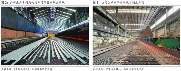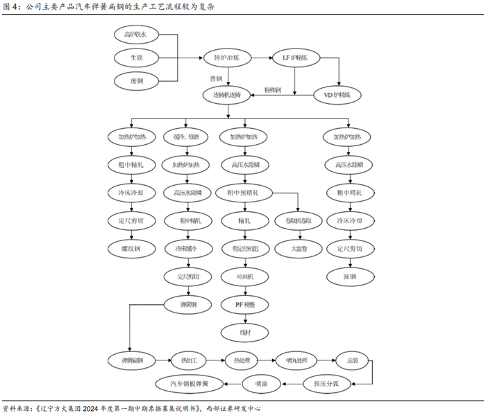 公司是一家集采矿、炼焦、烧结、炼铁、炼钢、轧材生产工艺于一体的钢铁联合企业,其中汽车用弹簧扁钢和汽车板簧是公司的特色产品,国内市场占有率多年保持第一,并出口十多个国家及地区,品种规格齐全;公司生产的汽车板簧连续多年稳居全国市场占有率第一,销售市场覆盖国内大多数核心汽车厂家;同时,公司可生产汽车零部件用钢“冶炼-轧制弹扁-板簧”中各环节产品,产业链优势明显。根据公司2024年年报内容,汽车板簧产销量分别为11.00、11.25万吨;弹簧扁钢产销量分别为48.59、48.71万吨;优线产销量分别为95.68、95.61万吨;螺纹钢产销量分别为278.70、278.27万吨;铁精粉产销量分别为25.65、36.74万吨。