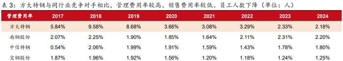 管理费用率方大特钢处于较高水平。2017-2024年,方大特钢的管理费用率分别为5.8%、9.6%、8.7%、3.7%、3.1%、3.3%、2.3%、2.2%,在与其他4家钢铁行业头部公司的比较中均为较高水平(2024年与南钢股份持平),体现出公司对管理层的支持力度较强。