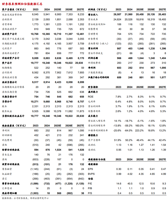 因此,我们预计公司,2025-2027年,收入分别为204.58、201.26、204.83亿元,增速分别为-5.1%、-1.6%、1.8%;综合毛利率分别为8.0%、9.0%、9.7%。