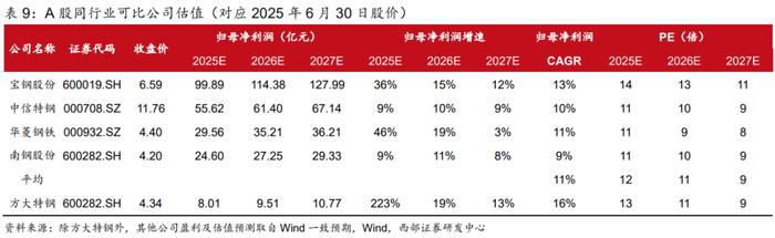 我们预测,2025-2027年,公司收入分别为204.58、201.26、204.83亿元,增速分别为-5.1%、-1.6%、1.8%;归母净利润分别为8.01、9.51、10.77亿元,增速分别为223.2%、18.8%、13.2%;EPS分别为0.35、0.41、0.47元,PE为13、11、9倍。我们选取A股钢铁行业4家可比公司宝钢股份、中信特钢、华菱钢铁、南钢股份作为比较(宝钢股份是钢铁行业龙头,主要产品为碳钢、不锈钢和特殊钢三大类,是我国最大、最现代化的钢铁联合企业;中信特钢是中信集团旗下钢铁业务的主要平台之一,是国内特钢长材龙头;华菱钢铁是中南地区最大的线棒材、板材、无缝钢管生产企业;南钢股份是国内中厚板及特钢长材生产龙头之一),计算出可比公司2025-2027年平均PE分别为12、11、9倍(对应2025年6月30日股价),考虑到公司:1)行业β方面,从行政化到市场化,高端、绿色、智能、兼并实现供给侧改革;2)公司α方面,内生激励力度足、成本管控好,外延集团资产注入确定性较强;3)我们预计2025-2027年,公司归母净利润CAGR为16%,显著高于行业平均水平(11%),因此我们给予行业平均水平溢价40%,对应16倍PE,对应目标价格为5.70元/股,首次覆盖,给予“买入”评级。