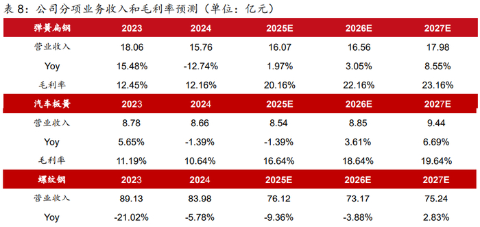1)弹簧扁钢:2022-2024年销量分别为41.32、50.26、48.71万吨,增速分别为-33.39%、21.64%、-3.08%;价格分别为4879.86、4417.95、4153.93元/吨,增速分别为-9.65%、-9.47%、-5.98%;考虑到弹簧扁钢是公司的特色产品,下游供需较为稳定,我们预计未来几年弹簧扁钢的价格虽有波动,但是波动幅度不会特别剧烈,因此我们预计2025-2027年,弹簧扁钢销量分别为51.15、53.70、56.39万吨,价格分别为3905.69、3789.30、3875.31元/吨,对应弹簧扁钢业务收入分别为16.07、16.56、17.98亿元,增速分别为1.97%、3.05%、8.55%;考虑到原材料价格持续下行,我们预计2025-2027年公司弹簧扁钢业务的毛利率分别为20.16%、22.16%、23.16%;