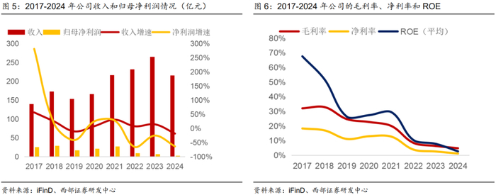 2017-2024年,公司收入规模从139.45亿元增长至215.60亿元,CAGR为6.42%,其中除了2019年(收入下滑10.97%)和2024年(收入下滑18.67%),其他年份收入均有增长;归母净利润体现出较强的周期性,2018年(29.27亿元)和2021年(27.32亿元)是归母净利润最高的年份,2022-2024年分别为9.26、6.89、2.48亿元,增速分别为-66.10%、-25.63%、-64.02%;扣非后归母净利润也是类似,2018年(29.02亿元)和2021年(26.53亿元)是最高的年份,2022-2024年分别为7.68、6.75、1.76亿元,增速分别为-71.04%、-12.20%、-73.87%。2022-2024年,毛利率分别为8.44%、6.35%、4.80%,净利率分别为3.86%、2.58%、1.17%,ROE(平均)分别为10.34%、7.79%、2.68%,无论是从净利润规模,还是从盈利能力(毛利率、净利率、ROE)来看,2024年均是公司自2017年以来表现最差的年份。分产品来看: