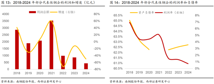 我们引用南钢股份年报披露的数据,2018-2023年,中钢协重点统计会员钢铁企业利润总额分别为2863、1890、2074、3524、982、855亿元,增速分别为41.10%、-30.90%、6.60%、59.70%、-72.27%、-12.47%。利润率分别为6.93%、4.43%、4.41%、5.08%、1.49%、1.32%,可以看出2022、2023年,无论是净利润的增速,还是利润率的表现,都出现了明显的下滑。2024年,钢铁行业经济效益进一步下降,中钢协数据显示,2024 年重点统计企业实现利润总额429亿元,同比下降50.3%;平均销售利润率0.71%,同比下降0.63个百分点。截至2024年末,重点企业资产负债率为62.72%,同比上升0.56 个百分点。存货占用资金6144亿元,同比下降5.8%;应收账款1588亿元,同比下降0.2%。